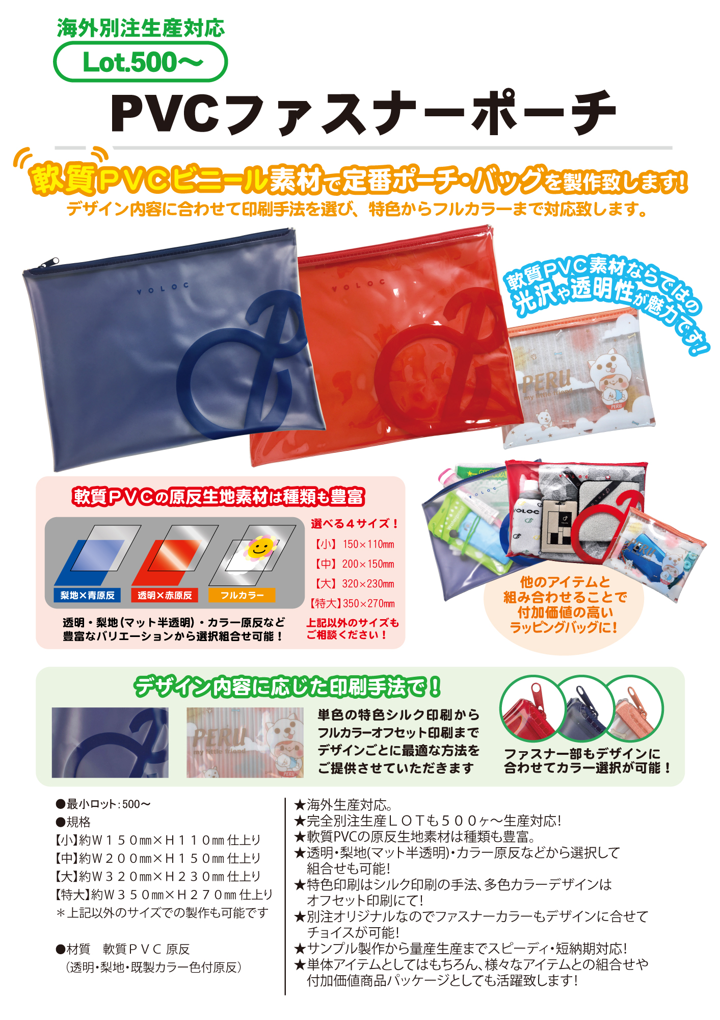 ファスナーポーチ :310×2mm B5:260×190mm ペンケース:190×75mm チャックポーチ B5:260×190mm ポストカードサイズ:185×130mm ペンケース:190×75mm 印刷色 4色カラー+白 表裏両面印刷 材質 軟質塩ビ・梨地 納期 約3週間透明素材をご希望の方はこちらの素材をお選びください 素材自体が透明のため、長方形のベタ貼りでも輪郭カットせずに綺麗に見えます。 輪郭カットをするとさらに境界がわかりづらくなりおすすめです。 但し注意点としまして、インクがのっているシルク印刷 印刷はバッグに縫製する前に生地の状態で1枚ずつシルク印刷で行います。 15周年記念のノベルティとしてオリジナルpvcポーチを製作致しました。 記念品になるので、pvcでも色有のカラフルな物で製作したく海外生産で対応が可能だったので